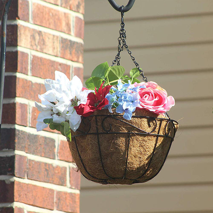 Hang in minutes with pre-installed chains and secure S-hooks. - Large capacity, circular frame allows enough space to create the perfect flower arrangement. - Simply add dirt and the desired plant. - Included pre-formed coco fiber liner provides superior drainage and air flow promoting healthier plants. - Sufficient depth allows for ample root growth.