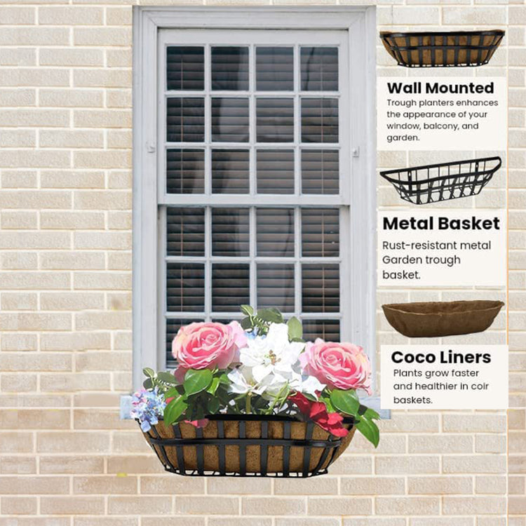 Wall Mounted Trough Planter enhances the appearance of your window, balcony, and garden. We have a huge collection of wall troughs that gives you a variety to select troughs as per your choice and gardening space. Our collection allows you to design your garden as per your requirements. Color: Black. Finishing is done with Weather Proof Coating for Longer Life. Strong and Sturdy Wall Trough. Lined with Coir Liner. Plants and Flowers are not included in this package. Wall Mounted Trough Planter/ Hayracks Our wall-mounted trough planter brings vibrant style to your home. Install them outside a window or under a balcony to create your unique garden world. With such a beautiful welcome, you will soon have birds serenading at your window. Vertical planting is a need of today's times due to shrinking garden space and also becoming a trend that is growing day by day. Wall troughs meet this purpose. It is also suitable for outdoor smaller gardens, courtyards, and balconies.