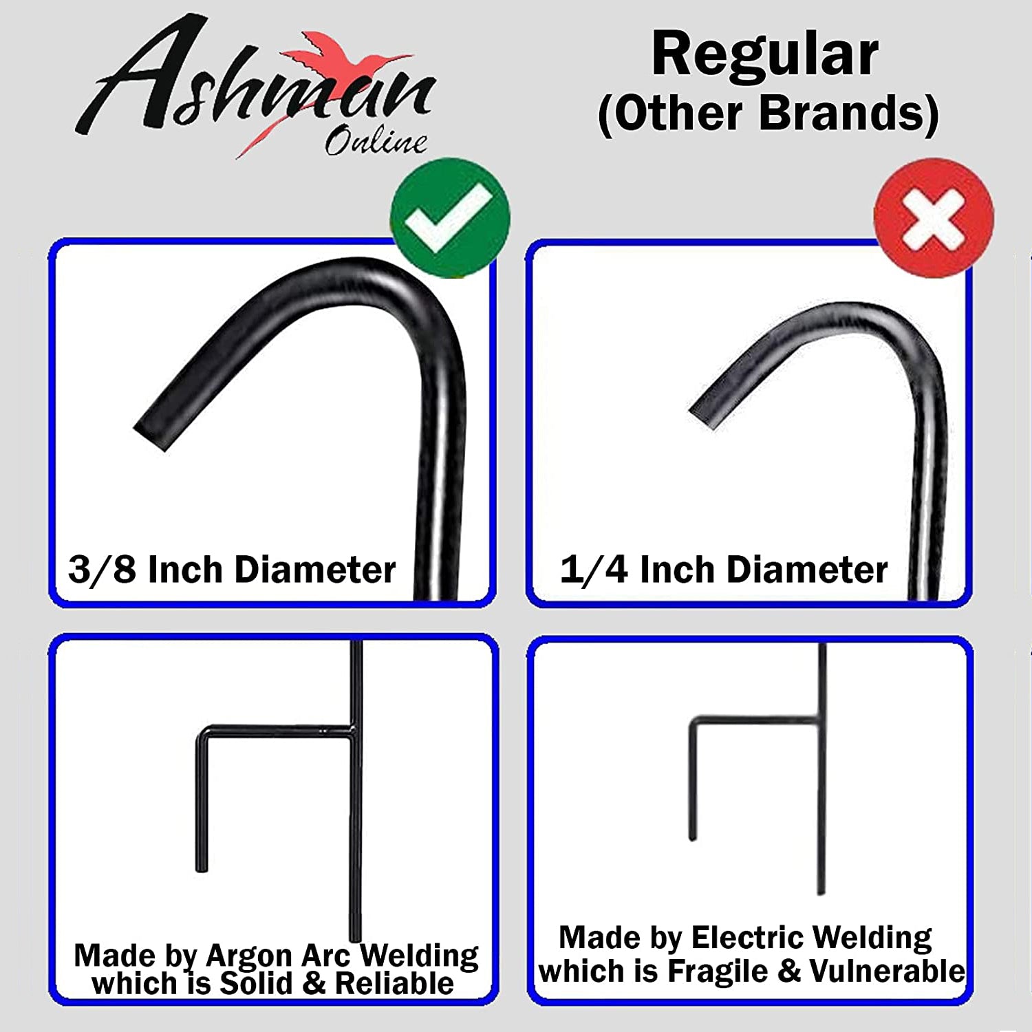 Turn Your Garden into a Majestic Utopia! Gorgeous Shepherd Hooks with the Perfect Balance of Tradition and Versatility. Enchant the outdoors of your house with tasteful decorations and ornaments. These Shepherd Hooks are tantalizing in their aesthetic value and can make anything stand out with ultimate beauty. Hang your flower pots, wind chimes, decorative lights and accented pieces, bird feeders, and more! Dexterous, sensual, and rustic, these hooks bring a wondrous subtlety to your garden, refining and invigorating it with beauty reminiscent of Victorian grace. At 50 inches of height and 10 inches wide, these hooks provide the stability, sturdiness, and hold that can easily withstand strong winds without affecting the object hanging from them. Elegant and Captivating Form - The luscious dark tint and eloquent finish of the hooks provide the perfect premise for enhancing anything hanging from it for a spellbinding effect! Perfect for wedding, house-warming, or Valentine gifts! Wondrous ability to effortlessly blend with surroundings and backdrops; providing a breathtaking visual effect for every beholder! Ashman Superior Quality Promise - We affirm the flawless grade and pristine quality metal used to construct these hooks as genuine works of art! - Able to support light to medium loads as in solar lights or signs with a meticulously designed 0.25-inch diameter pole built to last. Easy Assembly! - Finest in design-engineering ensures that the highest industry parameters, regulations, and standards are exceeded while maintaining dynamic customer care focus. Ashman prides itself in offering these premium and exclusive products for your lawn, garden, and outdoors. “Hassle-Free” - Personal Guarantee! Unsatisfied? Ask for a refund right away, anytime. Hassle-free!