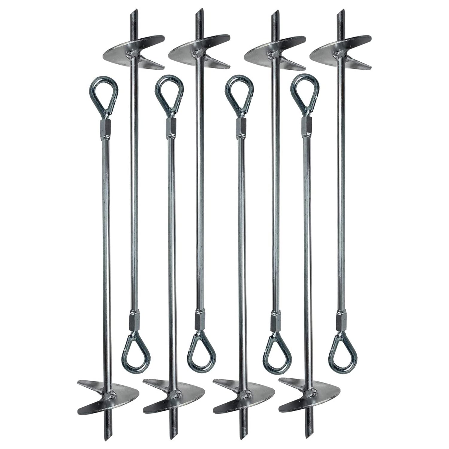 - GREAT VALUE WITH NUMEROUS USES: Package includes 8 Galvanized Ground Anchors which are 1/4 inch in diameter and 18 inches tall. The ground augers can easily be inserted in ground with help of drill machine, to have unlimited number of uses to securely tie down any structure.