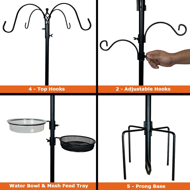 - PREMIUM DESIGN: Rust-resistant, sturdy steel pole stands 91 inches tall and 22 inches wide. Easily adjust the bird feeding bowl or mesh tray to any desired position by loosening and tightening wing nuts by hand. No tools are required! 5 Prong Base adds stability and allows easy arrangement. Just attach the pole stabilizer then step down to the plant. Mesh tray and water bowl detach for easy cleaning. *BIRD FEEDERS INCLUDED*
