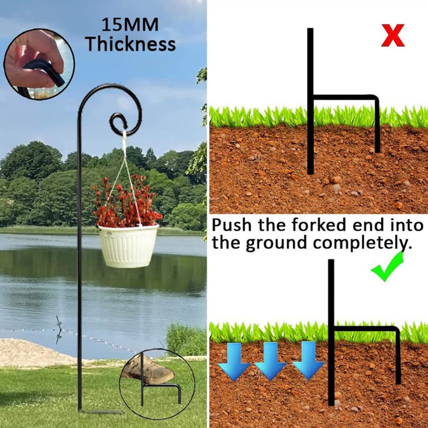 Easy to Install: Coming in one piece of solid metal, no assemble needed can be carried around easily. Welded brace near the base to anchor the hook into the soil and keep upright.