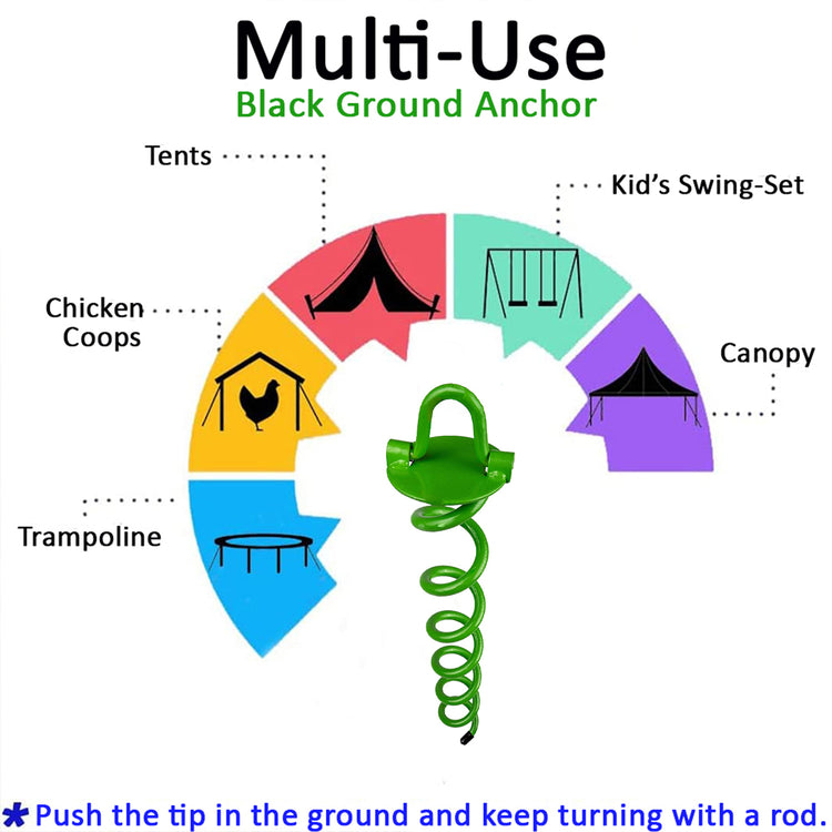 - ✔ MULTIPLE APPLICATIONS – Strong spiral anchors (Pack of 1) which are powder-coated, solid steel augers and have unlimited uses, for instance, to tie down to ground playsets, trampolines, sheds, carports, gazebos, travel trailers, cabins, chicken coops, garage, mobile homes, small buildings, playground playsets, kid’s swing sets, slides, deer stands, canopies, temporary shelters, campers, metal fencing, and wooden fence.