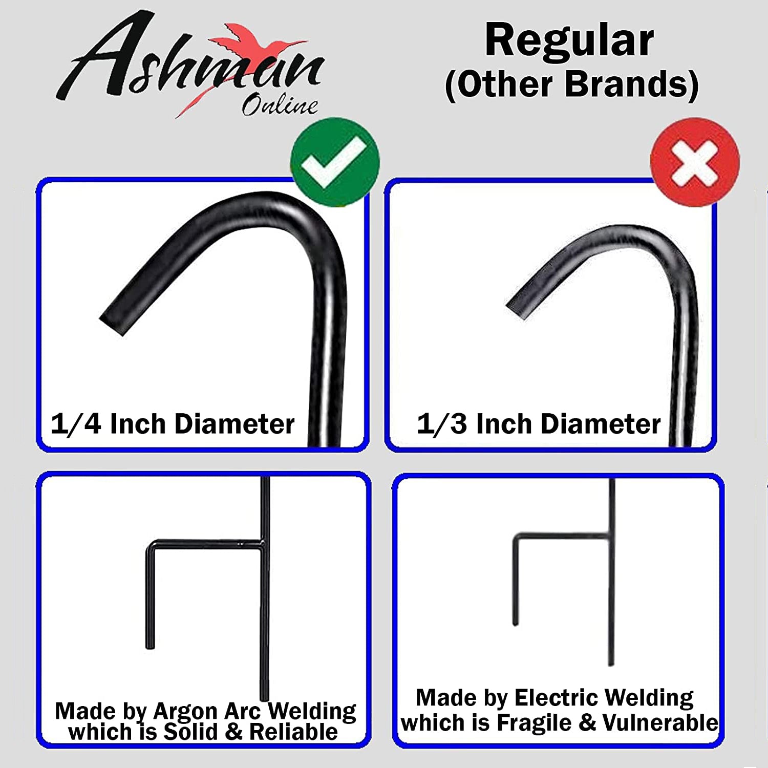 Wondrous ability to effortlessly blend with surroundings and backdrops; providing a breathtaking visual effect for every beholder! Ashman Superior Quality Promise - We affirm the flawless grade and pristine quality metal used to construct these hooks as genuine works of art! - Able to support light to medium loads as in solar lights or signs with a meticulously designed pole built to last. Easy Assembly!