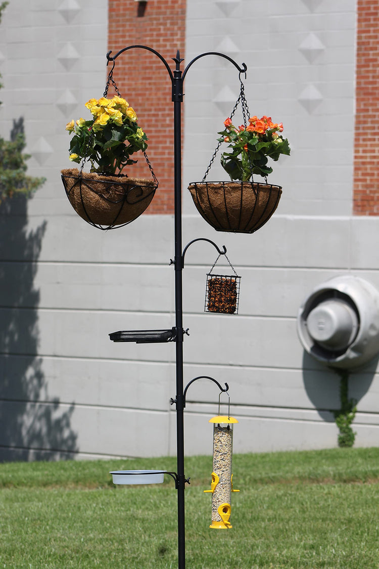Ashman Bird Feeding Station, (Bird Station 5 Prongs with Hanging Suet Feeder), 22" Wide x 91" Tall with Top Hook, Two Small Arms and Water Dish, Hanging Suet Cage Bird Feeder Stand
