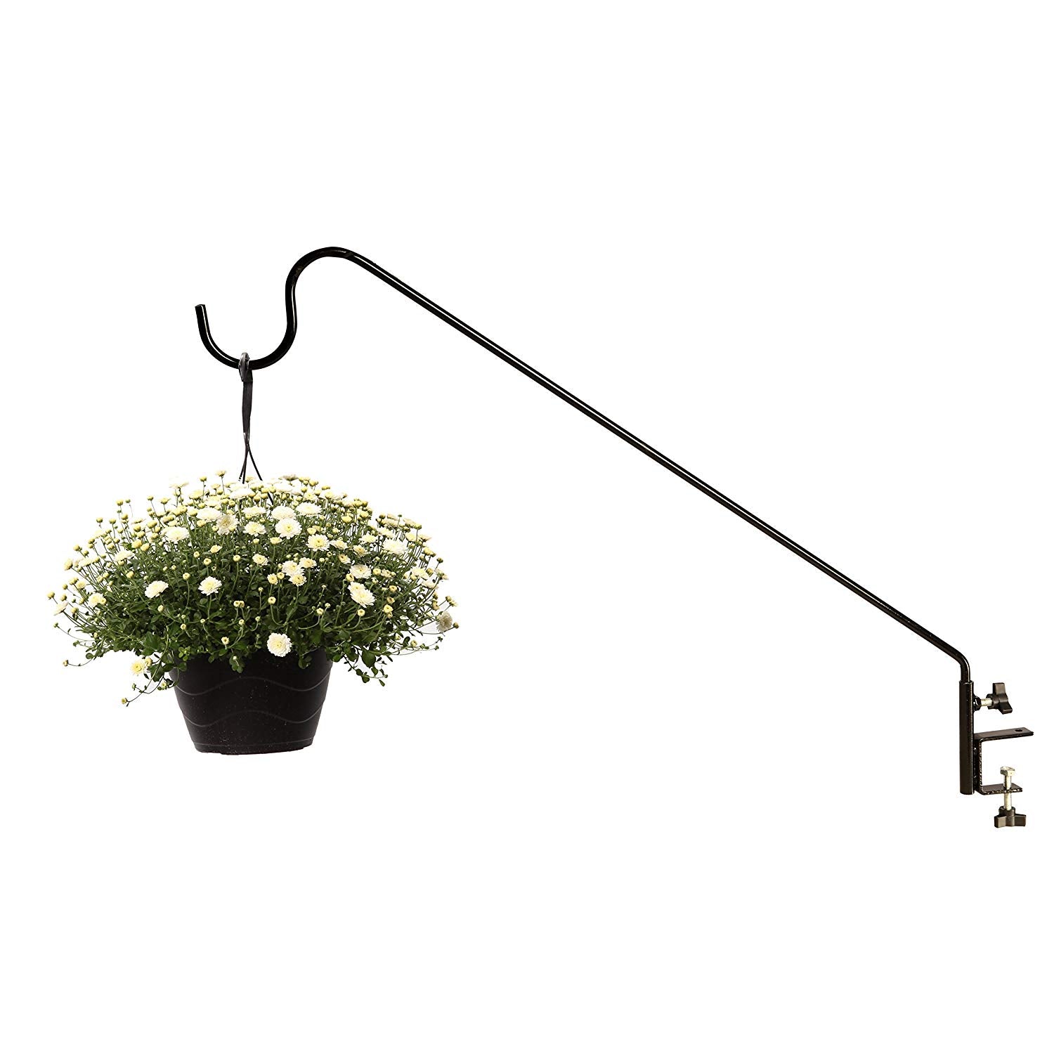 Allows you to easily hang feeders, plants, lanterns, and other accessories from your deck rail The carefully - designed arm arches forward positioning the feeder out and over the side of your deck Premium quality steel that is rust-resistant and durable provides for a long-lasting product Seeds and bird droppings fall away from the deck preventing you from having to constantly clean up messes. No tools are required for installation, simply tighten the hand knob.