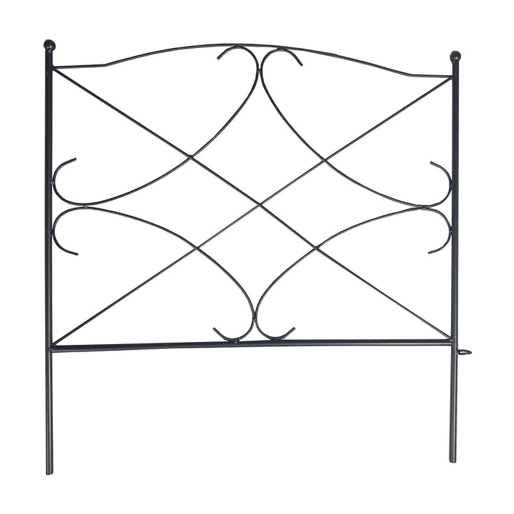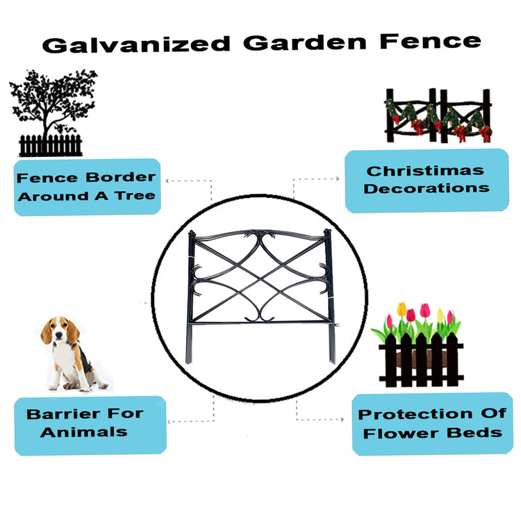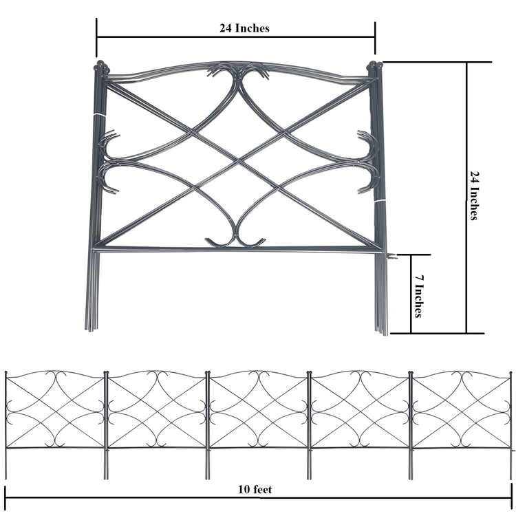- Decorative metal garden fence with single panel size 24In x 10ft, 5 Panels in total. These metal fence panels for the front yard are made of black Iron with a vinyl PVC powder coated surface that will enable you to use the garden fence outdoors durably.