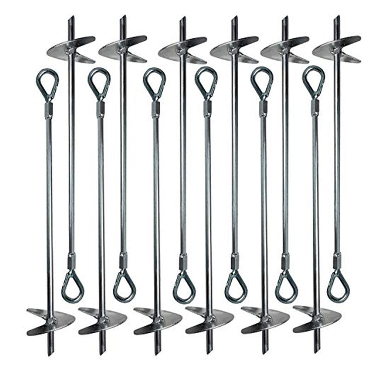 - GREAT VALUE WITH NUMEROUS USES: Package includes 12 Galvanized Ground Anchors which are 1/4 inch in diameter and 18 inches tall. The ground augers can easily be inserted in ground with help of drill machine, to have unlimited number of uses to securely tie down any structure.