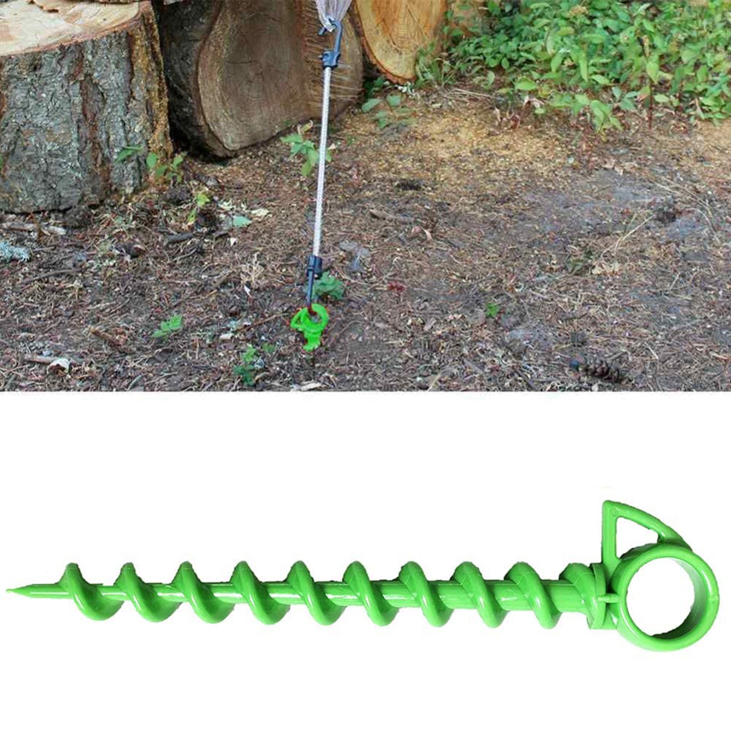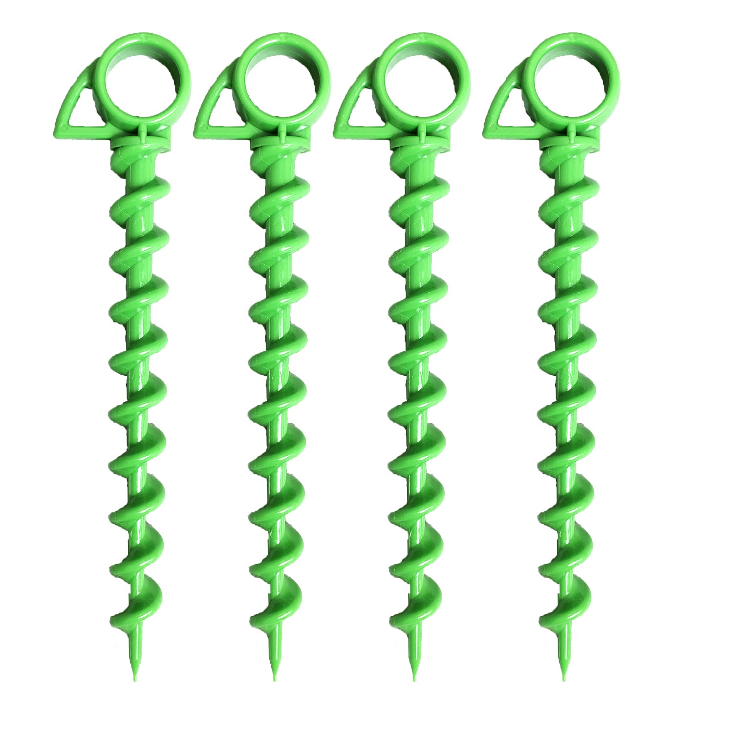 - Easy to Install - The spiral design makes anchor relocation and removal easy in compact soils. It is rugged yet easy to use and comes in a convenient pack of 4. The bright green color and hinged ring keep people from tripping over it when not in use. It only takes seconds to insert them into the ground and tie them off.