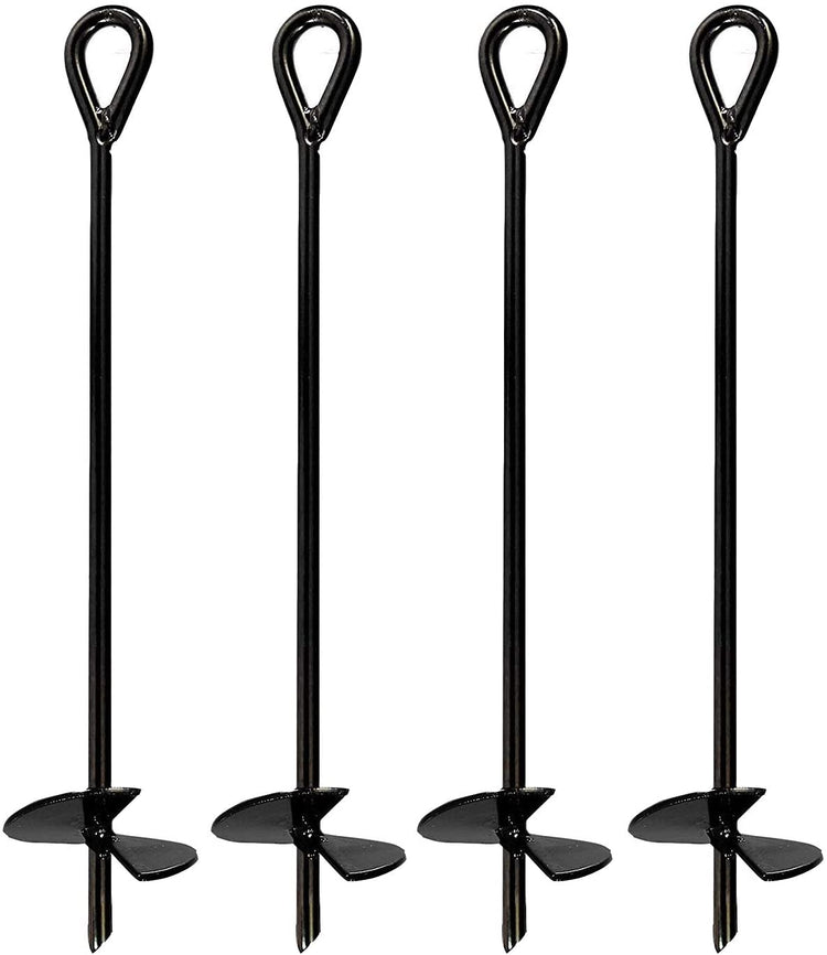 - GREAT VALUE WITH NUMEROUS USES: Package includes 4 Ground Anchors which are 1/4 inch in diameter and 30 inches tall and they are packaged in brown box . The ground augers have unlimited number of uses and can tie down to the ground structures like sheds, car ports, gazebos, travel trailers, cabins, chicken coops, garages and small buildings, trampolines, playground play-sets, kid’s swing sets, slides, deer stands, canopies, temporary shelters, campers, fencing and fence